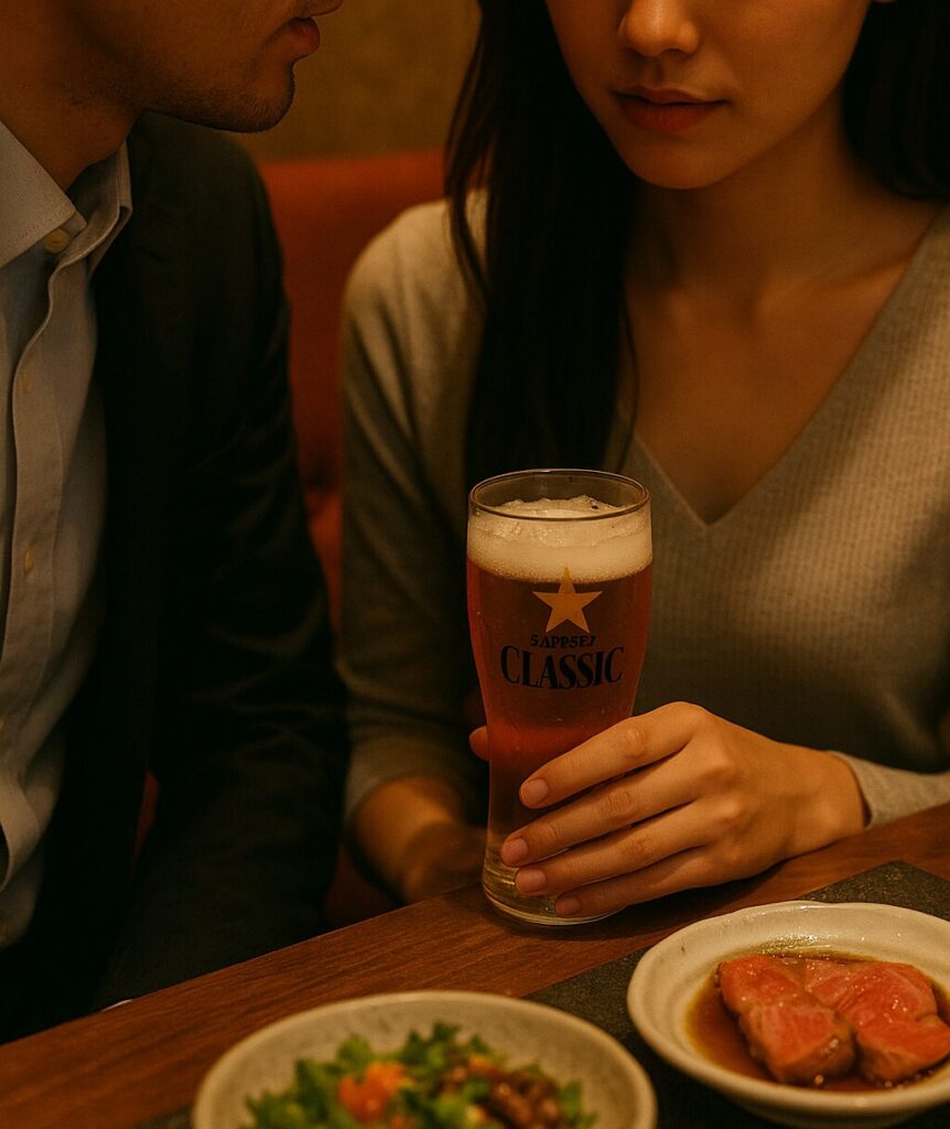 彼の瞳は真剣に見えた。美晴の胸は早鐘を打ち、サッポロクラシックの苦みがまだ残る舌の上で、唇が乾く。グラスを持つ手さえも微かに震えていた。どう返せばいいのかわからず、ただ視線を落とした。