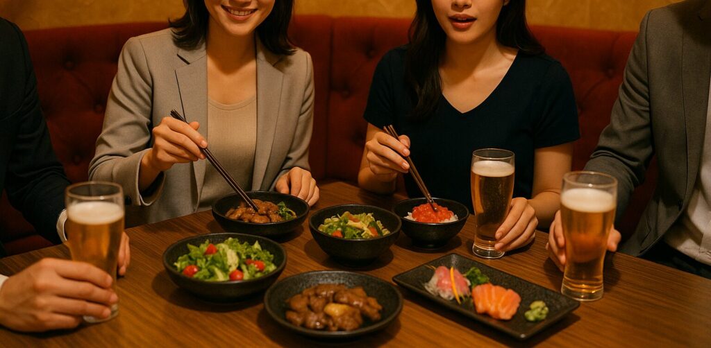 札幌の現地男性二人に誘われ、四人が足を踏み入れたのは、すすきのの裏通りにある小洒落たダイニングバーだった。間接照明が柔らかく灯り、低く流れるジャズが耳に心地よい。深く沈むソファ席に腰を下ろすと、自然に男女二人ずつの並びになった。